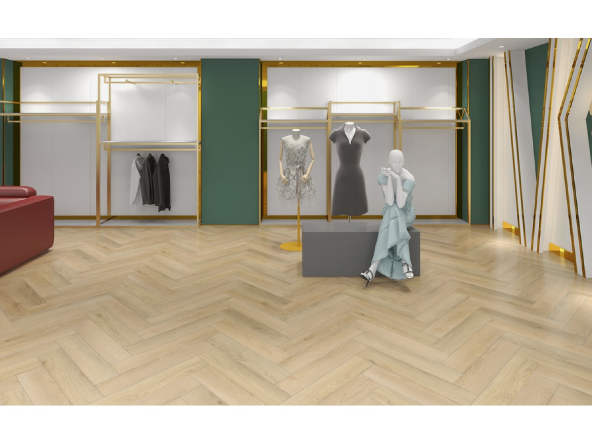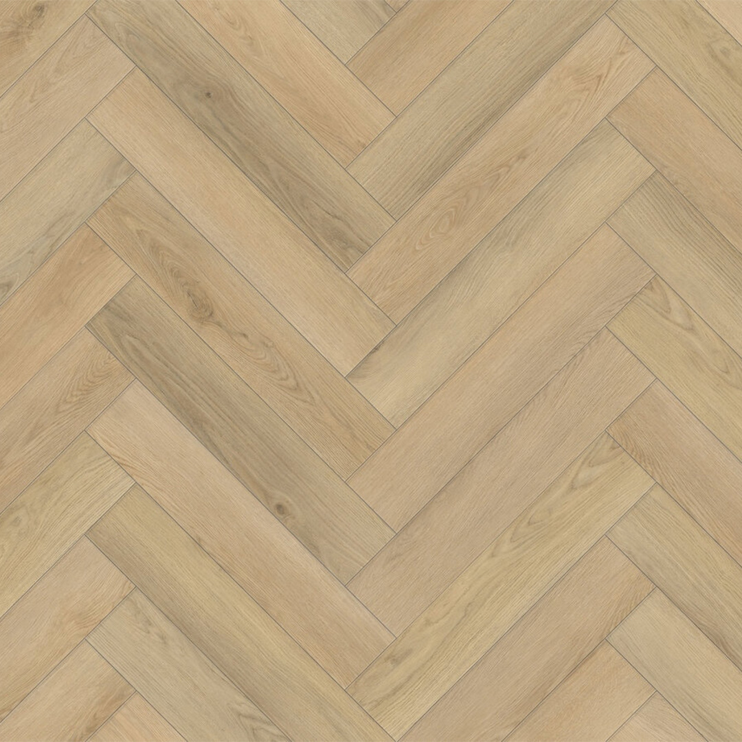 PVC vloer in visgraat. Het oppervlak is slijtvast en eenvoudig te reinigen, waterbestendig en geschikt voor keuken, hal en badkamer (buiten directe douchezone). Montage: klik (zwevend).
