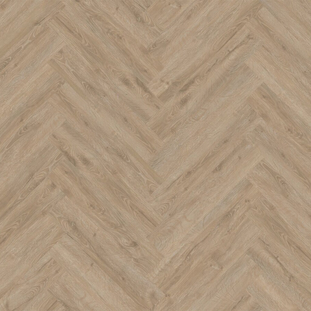 PVC vloer in visgraat. Het oppervlak is slijtvast en eenvoudig te reinigen, waterbestendig en geschikt voor keuken, hal en badkamer (buiten directe douchezone). Montage: klik (zwevend).